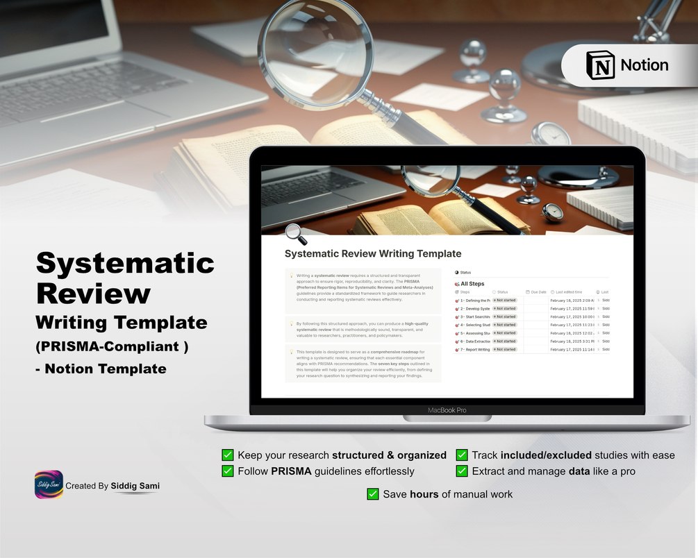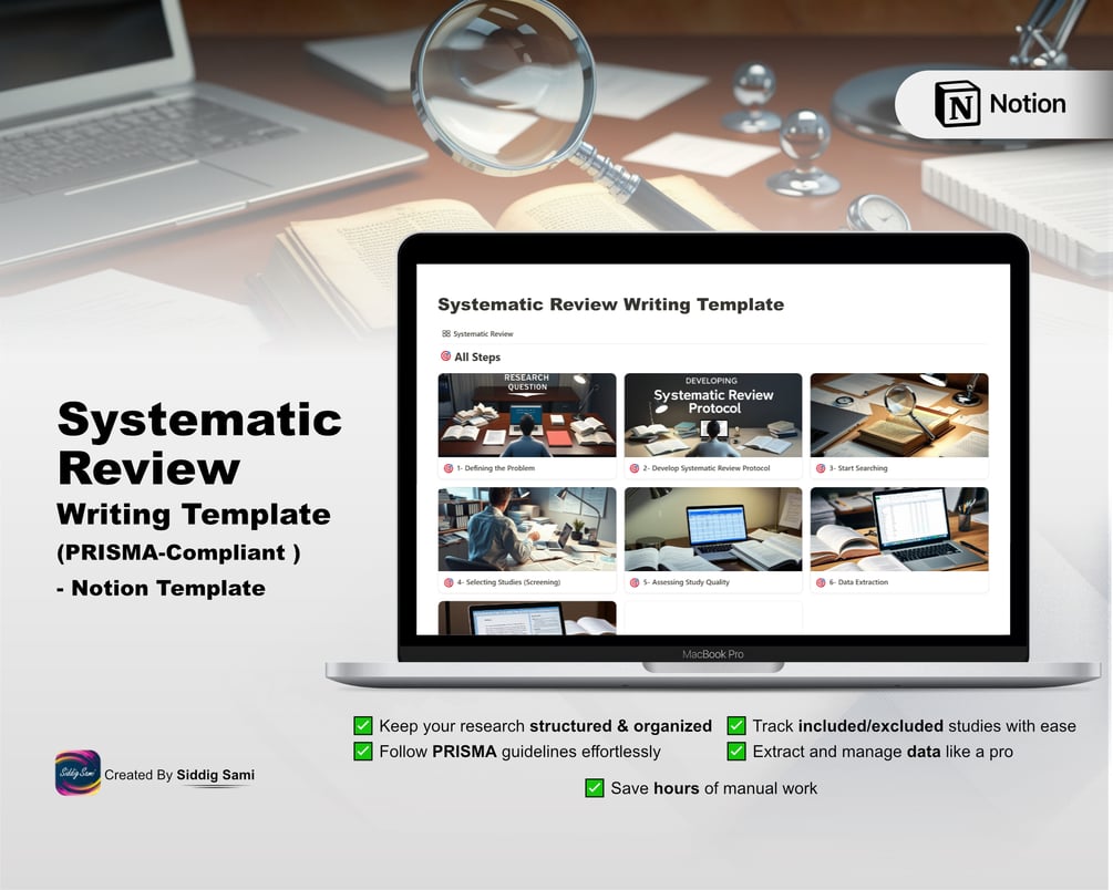 ✅ Pre-Built Sections – Includes all 7 essential steps: Defining the problem, protocol development, literature search, study selection, quality assessment, data extraction, and report writing.